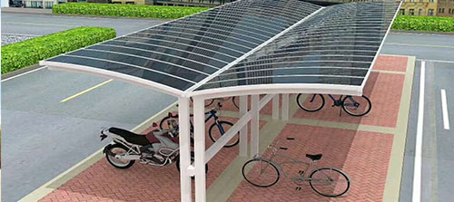 鋁合金自行車車棚頂棚能夠抵擋90%的紫外線,有效預制紫外線對車輛的傷害,延長車輛的使用壽命
