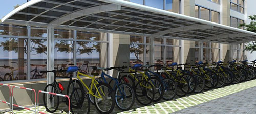 鋁合金自行車車棚采用靜電粉末噴涂工藝,耐腐蝕,不褪色,抗老化,使用壽命長