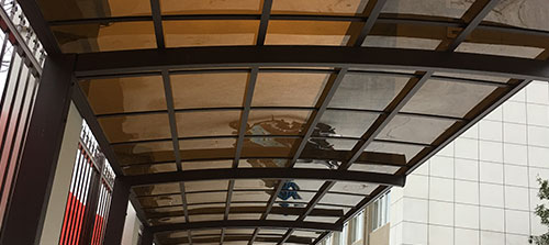 頂棚采用進(jìn)口聚碳酸酯板,抗沖擊比玻璃強(qiáng),有效防止高空墜物